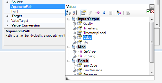 A binding can be involved in multiple binding operations (e.g. read and write), but there is just a single arguments path selection for the whole binding, and the set of arguments might be different for each operation. The arguments path should be valid for all the binding operations that are enabled on the binding. The drop-down editor offers a combined view of the possible arguments. For this reason, argument categories can change (by combining) as well: For example, in OPC DataAccess, a Value is an output in the Read operation, but it is an input in the Write operation. It is therefore shown under the Input/Output category, when both Read and Write binding operations are enabled on the binding.