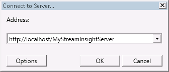 4. In the “Connect to Server…” dialog, enter the address as http://localhost/StreamInsight/MyStreamInsightServer , and press OK.