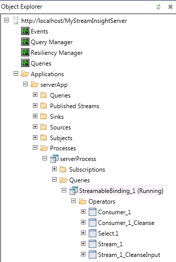 5. In the Object Explorer pane of the StreamInsight Event Flow Debugger, navigate and expand nodes as follows: