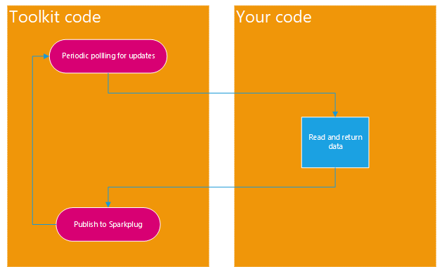 In the pull data provision model, you write a method that fulfills the requests for data ("Reads") by Rapid Toolkit for Sparkplug (polling for updates) by interrogating the underlying system, and returns the data that should be published to Sparkplug. Rapid Toolkit for Sparkplug calls your method periodically, and by doing so, it pulls the data.