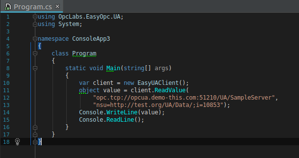 var client = new EasyUAClient(); object value = client.ReadValue( "opc.tcp://opcua.demo-this.com:51210/UA/SampleServer", "nsu=http://test.org/UA/Data/;i=10853"); Console.WriteLine(value); Console.ReadLine();
