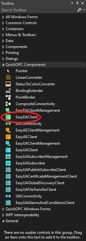 If you are targeting an environment different from Windows Forms (such as console application, Web, or WPF), your steps will be similar. Instead of dragging the EasyDAClient component from the Toolbox, simply reference the OpcLabs.EasyOpcClassic assembly, and create a new instance of OpcLabs.EasyOpc.DataAccess.EasyDAClient object.