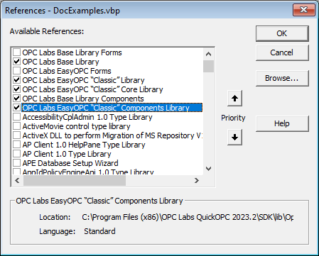 Note: If some of the QuickOPC the type libraries are not shown in the References list, use the button to locate and select them manually. The type libraries are installed under the SDK\lib subdirectory under the QuickOPC installation folder. Sometimes, simply restarting the Visual Basic 6.0 helps.