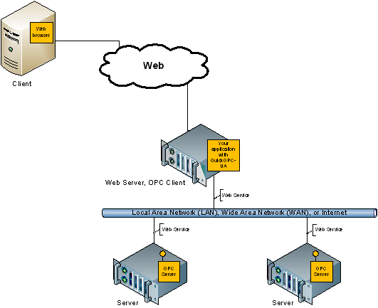 The Web application uses the types from QuickOPC-UA object model, and accesses data within OPC servers that are located on remote computers on the same LAN (Local Area Network). The communication with the target OPC server is performed by means of Web Services. No OPC-related (or indeed, Microsoft-related) software needs be installed on the client machine; a plain Web browser such as Internet Explorer (IE) or Firefox is sufficient.