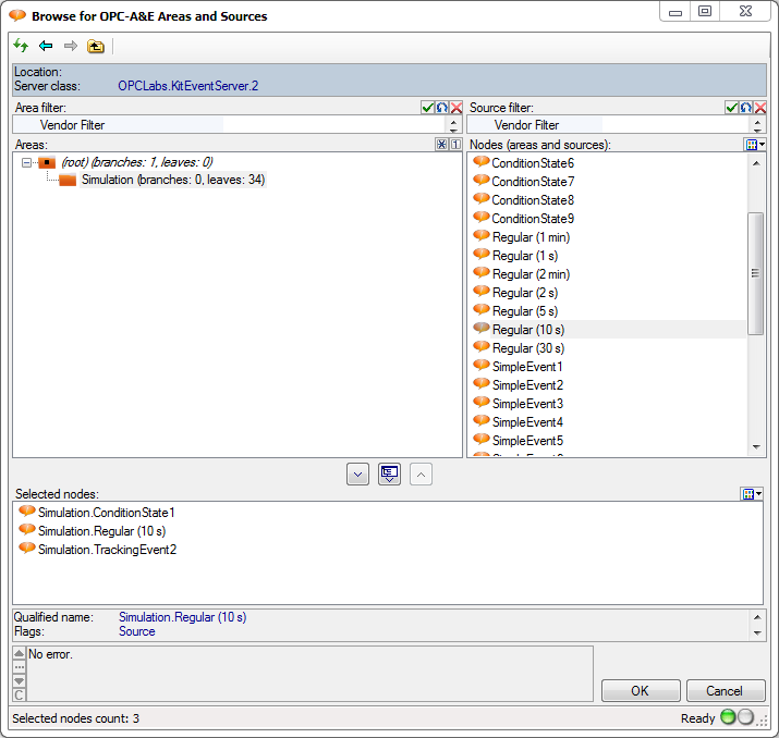 When the dialog is in single-select mode, you can obtain the information about the selected event area or source from the NodeDescriptor property. When the dialog is in multi-select mode, the information about the selected event areas is in the AreaElements property, and the information about the selected event sources in the SourceElements property; all event areas and nodes are available together in the NodeElements property.