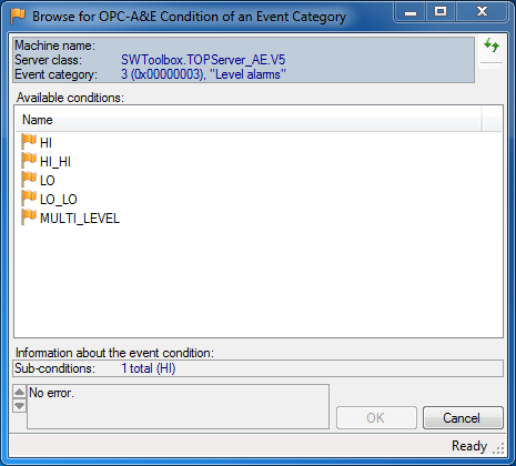 With AECategoryConditionDialog, your application can integrate a dialog box from which the user can select OPC-A&E condition available on a specified event category: