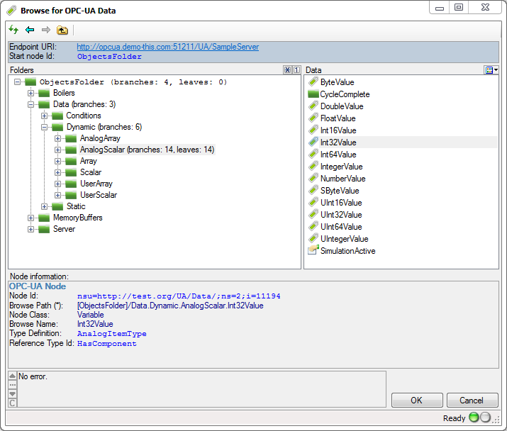 Rem This example shows how to let the user browse for an OPC-UA data node (a Data Variable or a Property). Rem Rem Find all latest examples here: https://opclabs.doc-that.com/files/onlinedocs/OPCLabs-ConnectivityStudio/Latest/examples.html . Rem OPC client and subscriber examples in VBScript on GitHub: https://github.com/OPCLabs/Examples-ConnectivityStudio-VBScript . Rem Missing some example? Ask us for it on our Online Forums, https://www.opclabs.com/forum/index ! You do not have to own Rem a commercial license in order to use Online Forums, and we reply to every post. Option Explicit Const DialogResult_OK = 1 Dim DataDialog: Set DataDialog = CreateObject("OpcLabs.EasyOpc.UA.Forms.Browsing.UADataDialog") DataDialog.EndpointDescriptor.UrlString = "opc.tcp://opcua.demo-this.com:51210/UA/SampleServer" DataDialog.UserPickEndpoint = True Dim dialogResult: dialogResult = DataDialog.ShowDialog WScript.Echo dialogResult If dialogResult <> DialogResult_OK Then WScript.Quit End If ' Display results WScript.Echo "EndpointDescriptor: " & DataDialog.EndpointDescriptor WScript.Echo "NodeElement: " & DataDialog.NodeElement