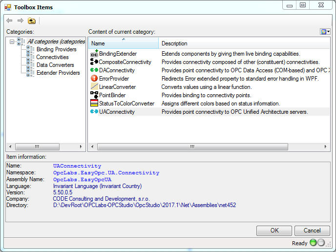 As a result, in most cases you can simply “forget” about the need to place the BindingExtender or the PointBinder onto the component tray – simply place the connectivity (DAConnectivity, UAConnectivity or CompositeConnectivity) from the toolbox items onto the component tray, and the rest will be taken care of. Just remember that you should not delete the BindingExtender or the PointBinder from your form (window), even though you have not explicitly placed it there.