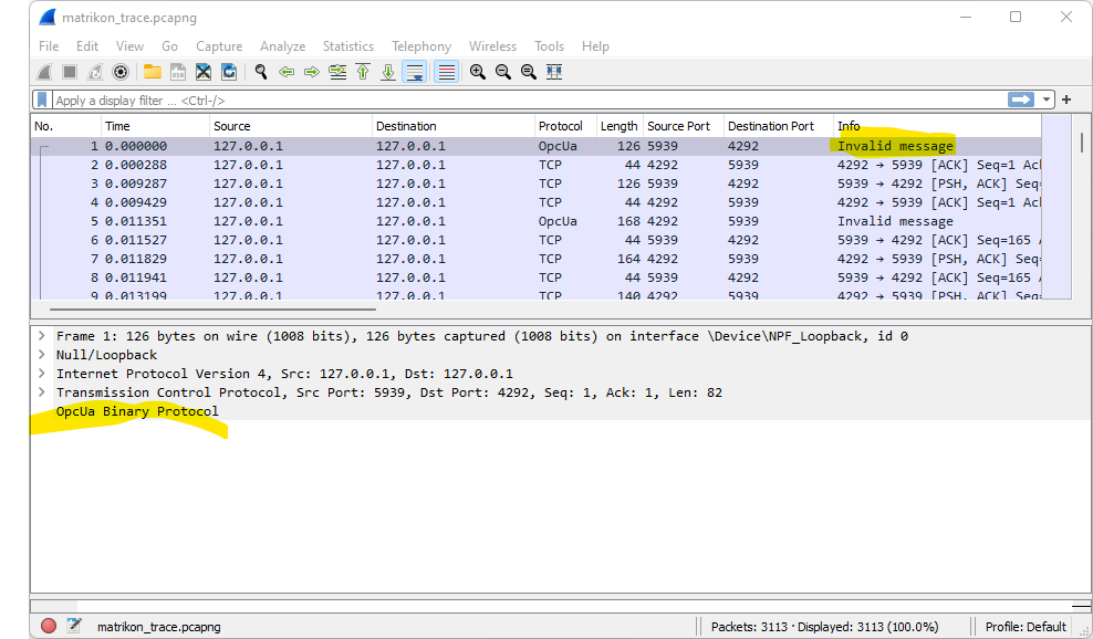 I attach you the WireShark trace files, connecting with Matrikon and the other one connecting with OpcLabs controls.