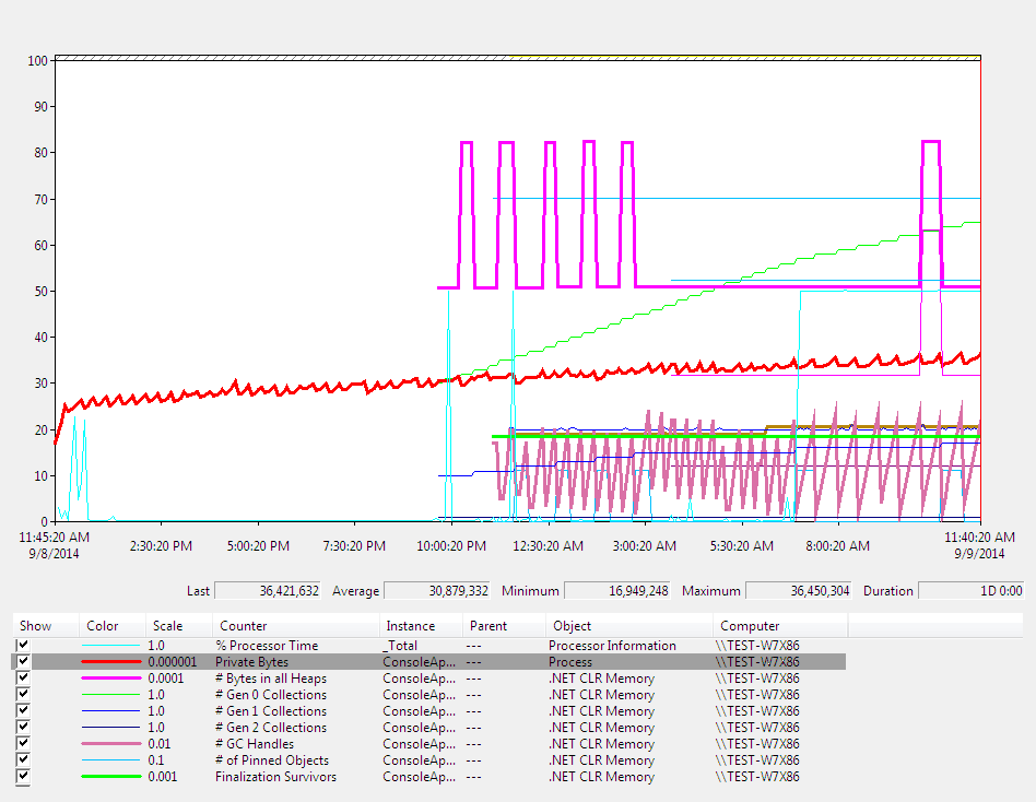 - Increase in "Private Bytes" (thick red line) very roughly 10 MB
