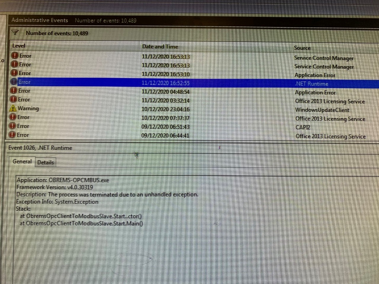 I checked the windows event log and found the following error.