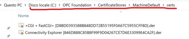 1. This file is also in "c:\ProgramData\OPC Foundation\CertificateStores\MachineDefault\certs". This couldbe fixed simply by copying it in there, BUT it's of no use without: