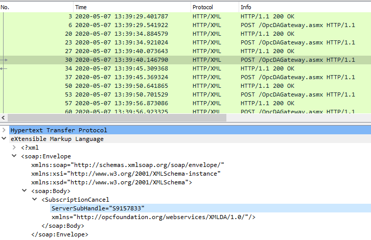 While investigating a communication between my application and Siemens OPC XML-DA Gateway server, I found a lot of subscription cancellation requests. They happen immediately after receiving a response to the subscribe request . The response of the OPC server is very slow. I don't know what is wrong. Could you help me?