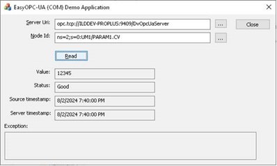 Dim value: value = Client.ReadValue("opc.tcp://ILDDEV-PROPLUS:9409/DvOpcUaServer", "ns=2;s=0:UM1/PARAM1.CV")