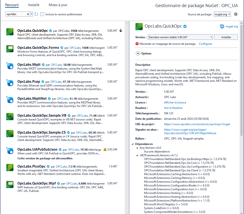 Le package « OpcLabs.QuickOpc 5.80.347 » est introuvable dans la ou les sources principales suivantes : « C:\Users\U\.nuget,C:\Program Files (x86)\Microsoft SDKs\NuGetPackages,C:\Program Files (x86)\OPC Labs OPC Studio 2024.1\NuGetPackages,C:\Program Files (x86)\Microsoft SDKs\NuGetPackages\, api.nuget.org/v3/index.json ». Vérifiez que toutes vos sources de package en ligne sont disponibles (OU) que l'ID de package et la version sont spécifiés correctement.